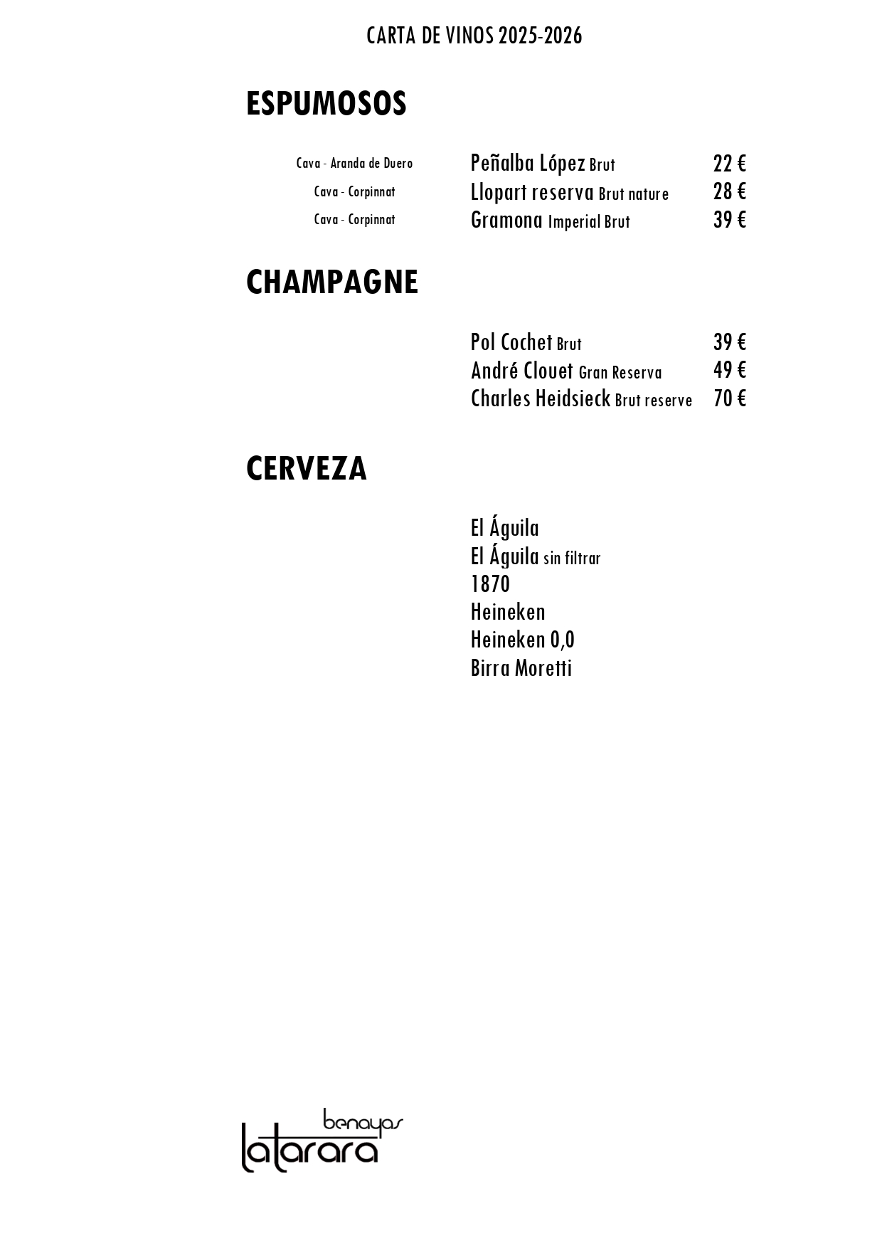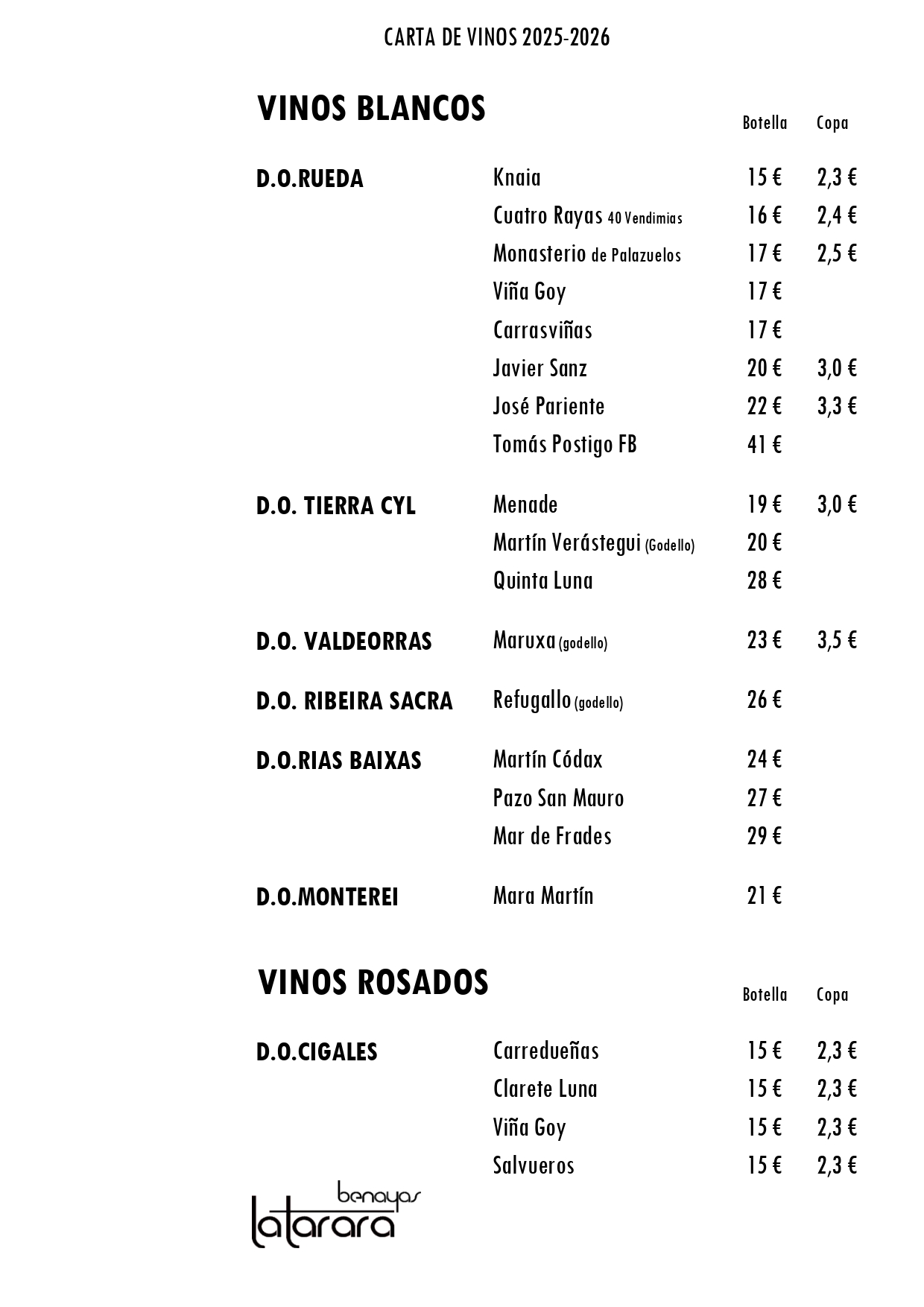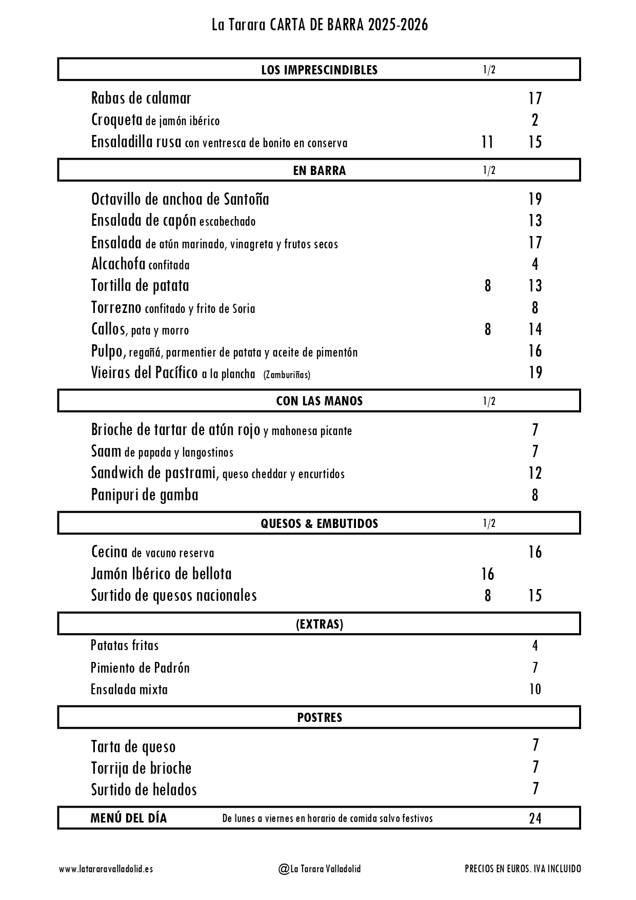 La carta de barra está compuesta por grandes clásicos como la croqueta de jamón, las rabas de calamar o la ensaladilla rusa, combinados con tapas más modernas que se van adaptando a la temporada; por eso siempre encontrarás lo que necesitas.